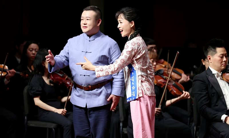 李梓郡教授(左一)在结项歌剧选段音乐会上与中国国家交响乐团女高音歌唱家潘田果演唱歌剧《小二黑结婚》的选段《咱们的婚姻自作主》