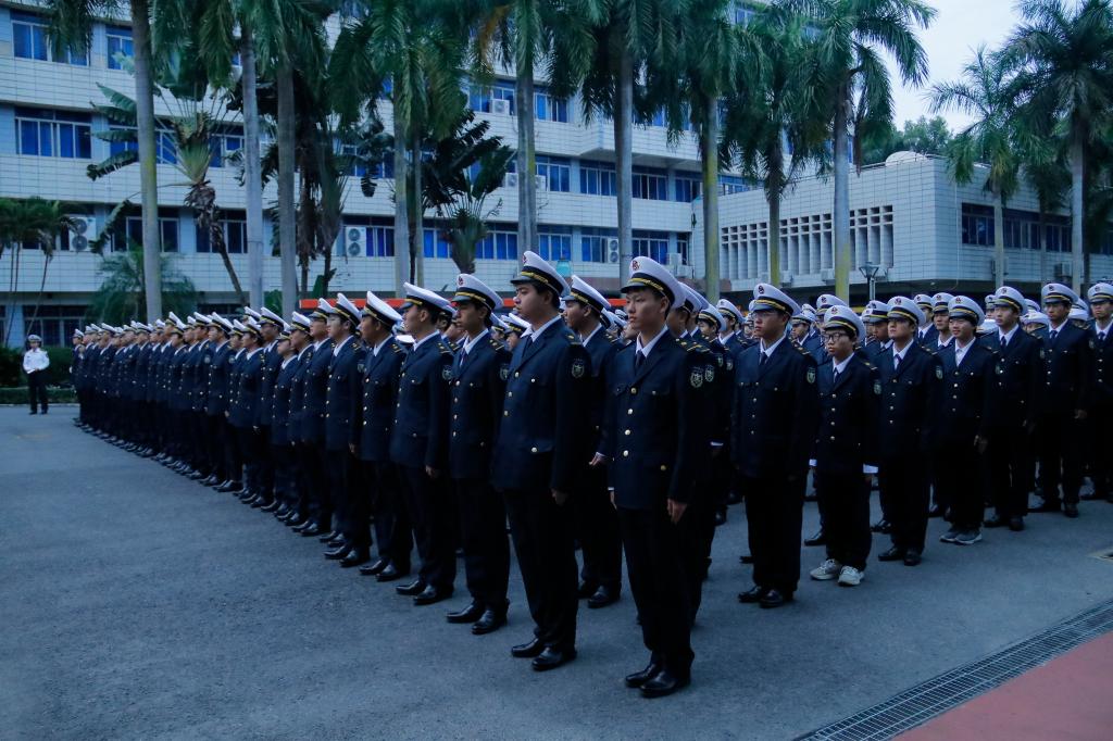 上午七点,升旗仪式正式开始。海滨校区国旗护卫队的同学们身着笔挺的制服,脚踏坚定的步伐,护送着五星红旗庄严步入升旗台前。他们动作整齐划一,步伐铿锵有力,展现出半军事化管理下学生们严格的纪律性和良好的精神风貌。随着国旗缓缓升起,全体师生面向国旗,齐唱国歌,行注目礼。