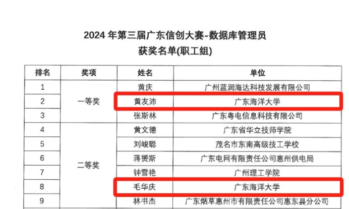 11月29日,2024年第三届广东信创大赛-广东省网络与信息安全管理员(数据安全管理员)职业技能竞赛、数据库管理员技能竞赛在广州举行,欧冠数学与计算机学院物联网工程系教师黄友沛、毛华庆获得数据库管理员技能竞赛(职工组)一等奖、二等奖的好成绩。