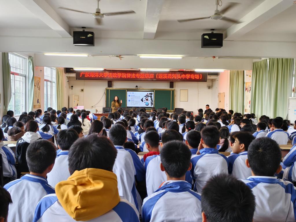 乡村要振兴,普法须先行。为打通普法工作最后一公里,提升中学生法律素养,营造文明、平安、和谐的校园育人环境,12月19日上午,学校驻河头镇帮镇扶村工作队联合法政学院,在遂溪县河头中学开展“校园霸凌零容忍,法律保护伴我行”主题的乡村振兴普法专题讲座。法政学院莫旻丹博士受邀主讲专题讲座,法政学院党委副书记黄善、学校驻河头镇帮镇扶村工作队队长兼镇党委副书记梁卓其、驻河头镇双村第一书记梁景元和部分乡村振兴工作队员、河头镇派出所所长罗成卓、河头镇平安法治建设办公室、河头镇综合河头中学班子成员、初一级班主任及初一级全体学生共500人参加讲座。讲座由河头中学郑培辉校长主持。