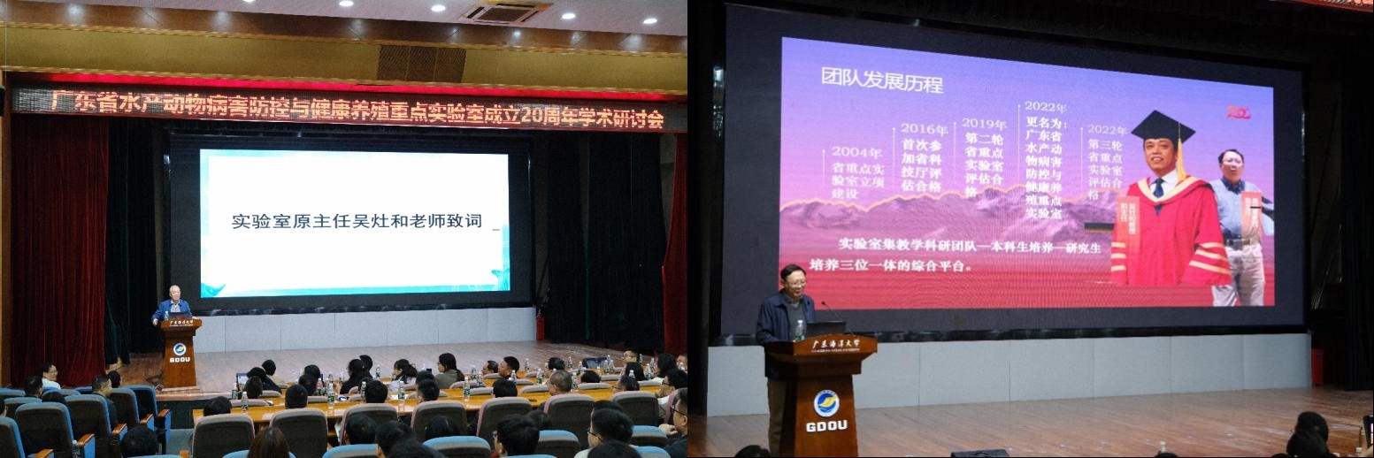 12月21日,为庆祝广东省水产动物病害防控与健康养殖重点实验室(以下简称重点实验室)成立20周年,重点实验室以“创新驱动、绿色发展”为主题举办20周年学术研讨会。本次会议邀请了重点实验室原主任吴灶和教授,重点实验室现主任简纪常教授,华南师范大学叶剑敏教授,欧冠研究生院副院长王蓓教授等领导及专家参加本次研讨会,其中还包括数十位工作在全国各单位的重点实验室毕业优秀校友。研讨会由重点实验室蔡双虎教授主持。