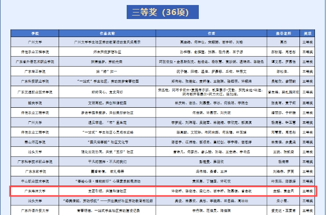 近日,由广东高校网络思想政治工作中心主办的广东高校“一站式”学生社区劳动教育微视频征集评选活动结果揭晓,共评选出一等奖22项、二等奖44项、三等奖66项。欧冠报送的作品《“一站式”社区让校园生活更美好》《党团引领,共建和谐社区》从全省386份参评作品中脱颖而出,分别荣获“共创社区美好”微视频赛道一等奖和三等奖。