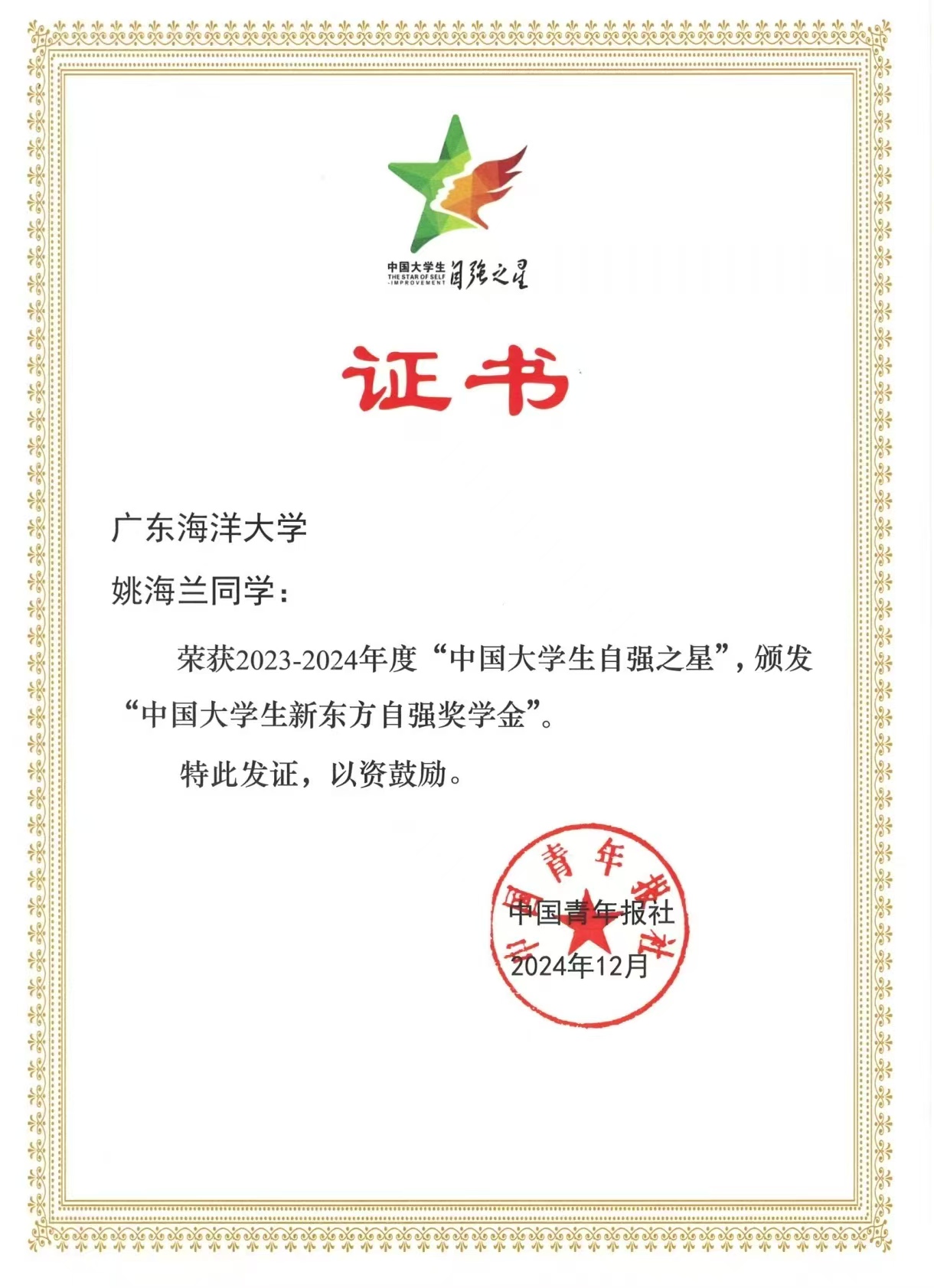 近日,2023-2024年度“中国大学生自强之星”评选结果揭晓,海洋与气象学院姚海兰同学脱颖而出,斩获“中国大学生自强之星”称号,同时荣获“中国大学生新东方自强奖学金”。