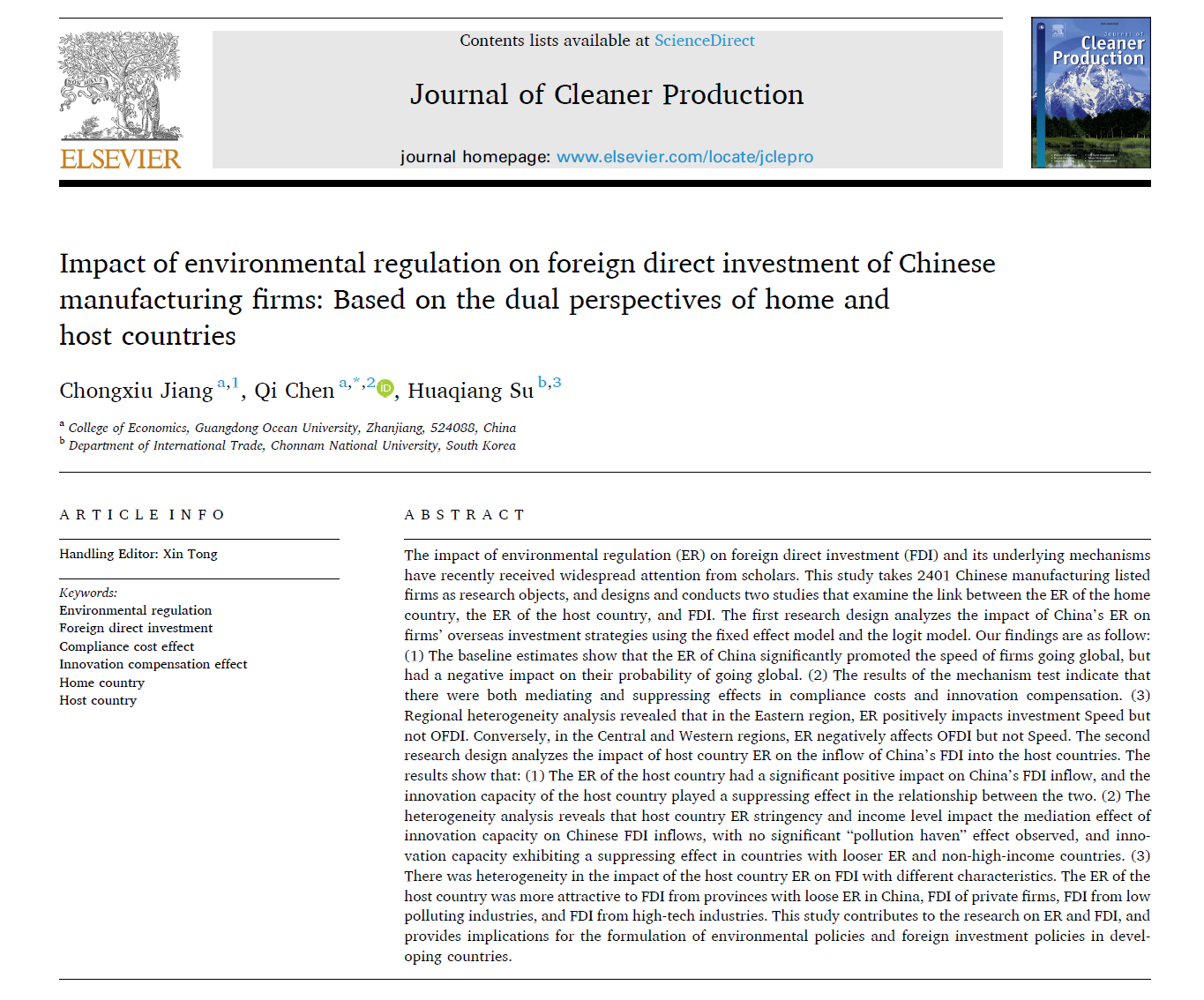 近日,欧冠经济学院蒋重秀副教授作为第一作者,陈琦老师担任通讯作者,在国际环境科学与生态学领域顶级期刊《Journal of Cleaner Production》(简称JCP)发表题为《Impact of environmental regulation on foreign direct investment of Chinese manufacturing firms:Based on the dual perspectives of home and host countries》的重要研究成果。该期刊2023-2024年最新影响因子为9.8,五年影响因子为10.2,位列JCR环境科学与生态学Q1区,同时入选中国科学院分区(2023升级版)一区TOP期刊。这是经济学院在环境经济与跨国投资交叉研究领域的重要突破。