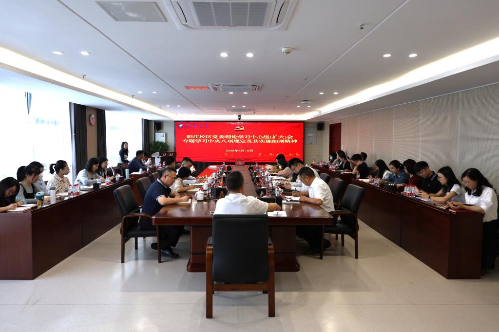 4月16日上午,阳江校区在海纳楼712会议室召开党委理论学习中心组(扩大)会议,专题学习中央八项规定及其实施细则精神。阳江校区党委副书记丁永成、麦冬宁,各职能部门负责人,机关全体人员参加会议。会议由丁永成主持。
