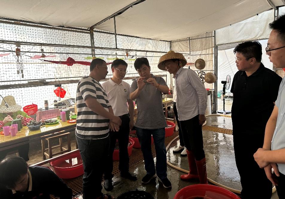 会后,在西连镇镇长陈杭、镇党委副书记劳良强以及驻镇帮镇扶村工作队队长肖永的陪同下,科技特派员团队一行深入珍珠养殖产业以及东风螺生态养殖示范基地实地调研。在珍珠贝插核作业区,水产养殖专家王庆恒教授手持样本贝为养殖户现场演示“插核”手术操作规范并逐一讲解相关内容。