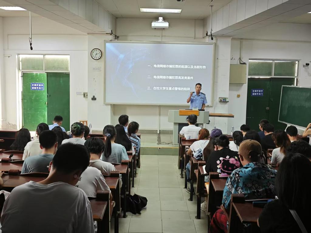 讲座中,曹伟以“特洛伊木马”“草船借箭”等历史典故为引,概述诈骗的起源与发展形势,生动阐释了诈骗行为的本质与危害。他结合当前境外电诈犯罪高发案件类型及特点,通过缅北地区真实案例,深入剖析了虚假投资、冒充公检法、网络刷单等常见诈骗手段的运作模式,并分享了公安机关在侦破此类案件中的实战经验。针对高校群体特性,曹伟重点提醒师生要警惕“网络刷单”“校园贷”等校园高发骗局,强调务必遵循“不听、不信、不转账”原则,遇可疑情况立即报警。