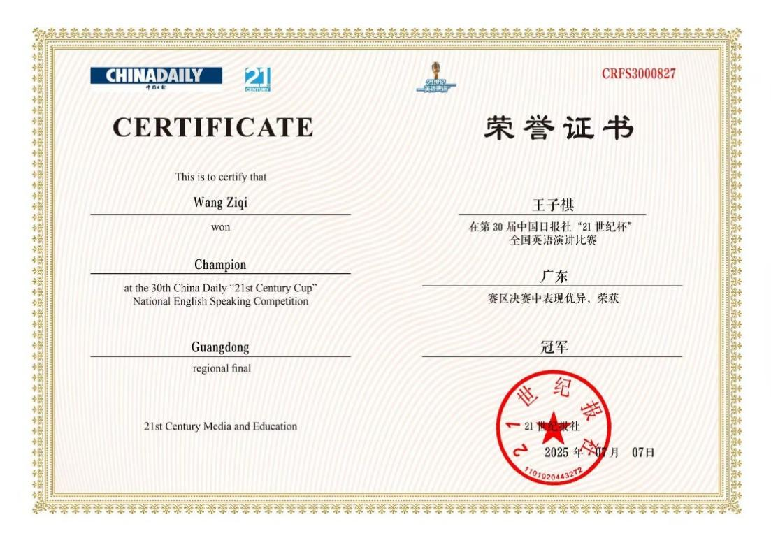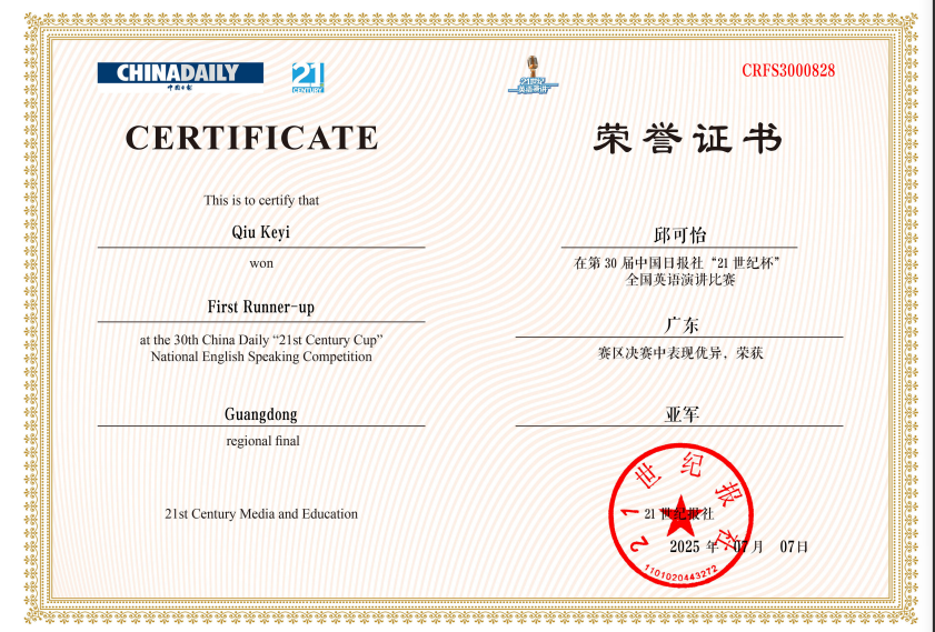 7月11日,第30届中国日报社“21世纪杯”全国英语演讲比赛广东赛区决赛落幕。欧冠英语卓越1221班王子祺同学和英语卓越1231班邱可怡同学分别荣获广东赛区决赛冠亚军,成功晋级国赛。