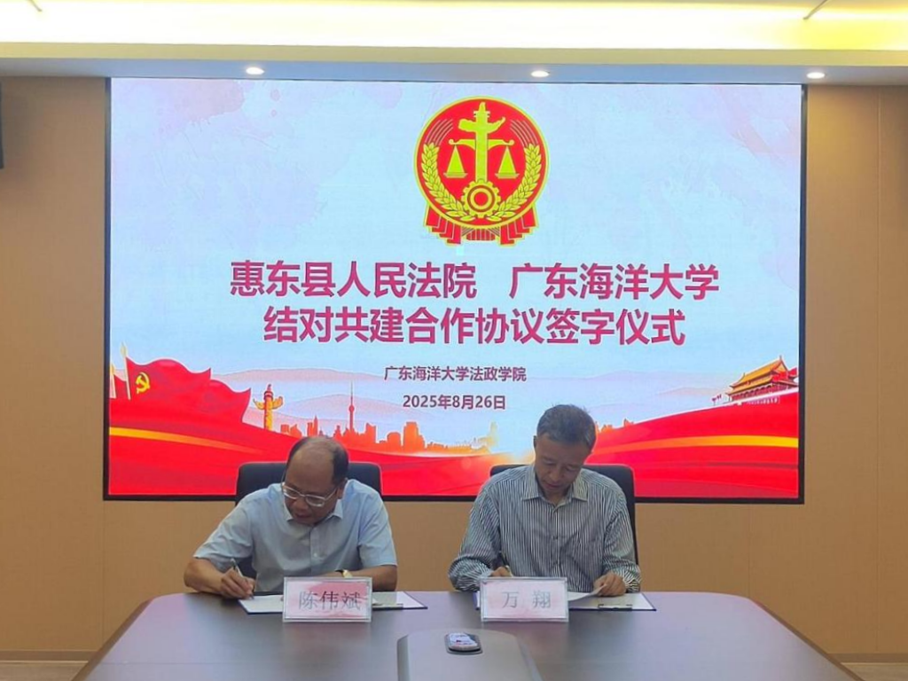 8月26日上午,欧冠与惠东县人民法院签订结对共建合作协议,标志着双方在法治人才培养、学术交流与司法实践深度融合方面迈出重要一步。签字仪式在文科楼1栋612室举行。惠东县人民法院院长万翔、副院长李丽丽、综合办主任吴镇泽、政治部副主任马塨、一级科员黄聪,以及法政学院党委书记林忠新、院长陈伟斌、副院长刘澍、实践教学中心副主任曹亚君参加了仪式。