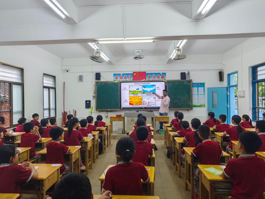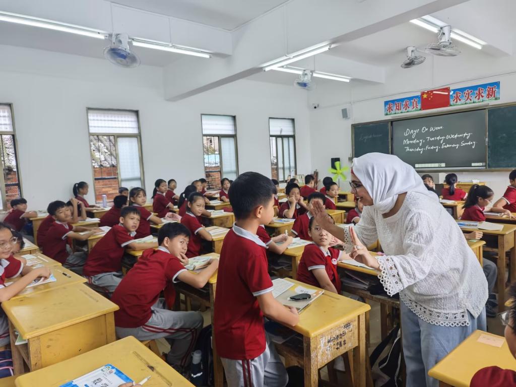 本次活动面向雷州第二小学五、六年级共10个班级进行英语教学。授课过程中,教导主任、班主任与协会成员共同配合,留学生顺利完成教学衔接,课程有序推进。课堂上,小学生们积极参与互动,展现出浓厚的学习兴趣和强烈的求知欲。留学生们则以亲切开放的授课风格,将轻松愉悦的教学氛围带入课堂,让学生充分体验英语学习的乐趣。课后,小学生们积极与留学生交流,现场气氛热烈融洽。课程结束后,雷州第二小学教师代表还带领支教团队参观了雷州“三元塔”,让留学生感受粤西地区雷州传统文化的独特魅力。