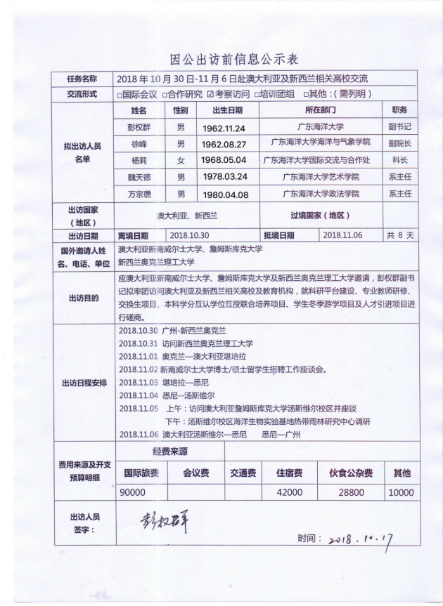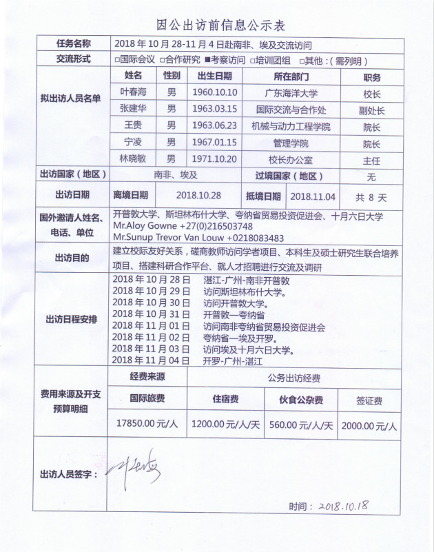 根据《关于进一步规范省部级以下国家工作人员因公临时出国的意见》的要求,现将欧冠官方网站因公出访信息予以公示。公示时间为2018年10月18日至23日。如有意见,请在公示期内,向相关单位反映。(国际交流与合作处电话:0759-2396206;纪委办电话:0759-2383501)