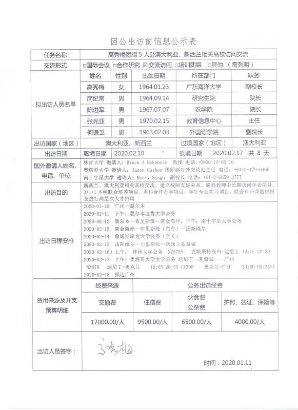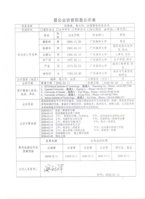 根据《关于进一步规范省部级以下国家工作人员因公临时出国的意见》的要求,现将欧冠官方网站因公出访信息予以公示。公示时间为2020年1月13日至1月17日。如有意见,请在公示期内,向相关单位反映。(国际交流与合作处电话:0759-2396206;纪委办电话:0759-2383501)