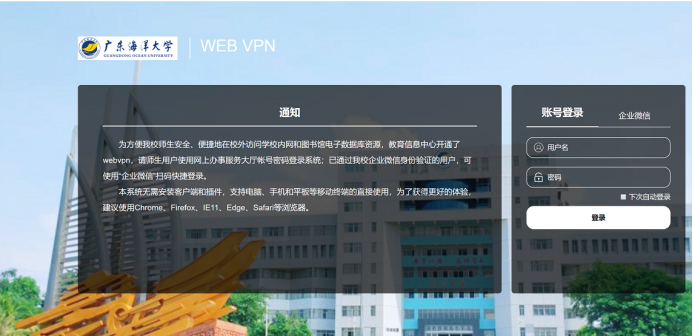 为方便欧冠师生安全、便捷地在校外访问学校内网和图书馆电子数据库资源,教育信息中心开通了webvpn资源访问系统(链接地址:https://webvpn.gdou.edu.cn),请师生用户使用网上办事服务大厅帐号密码登录系统;已通过欧冠企业微信身份验证的用户,可使用“企业微信”扫码快捷登录。