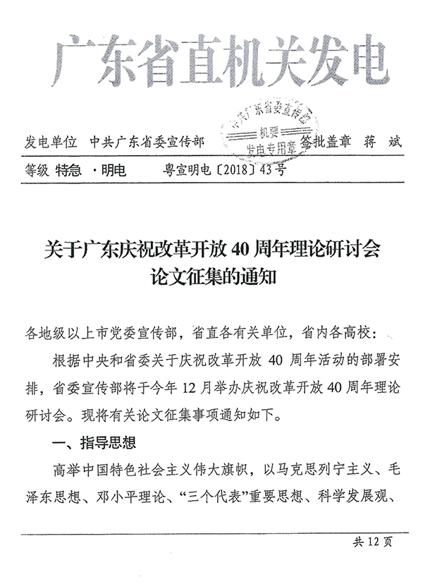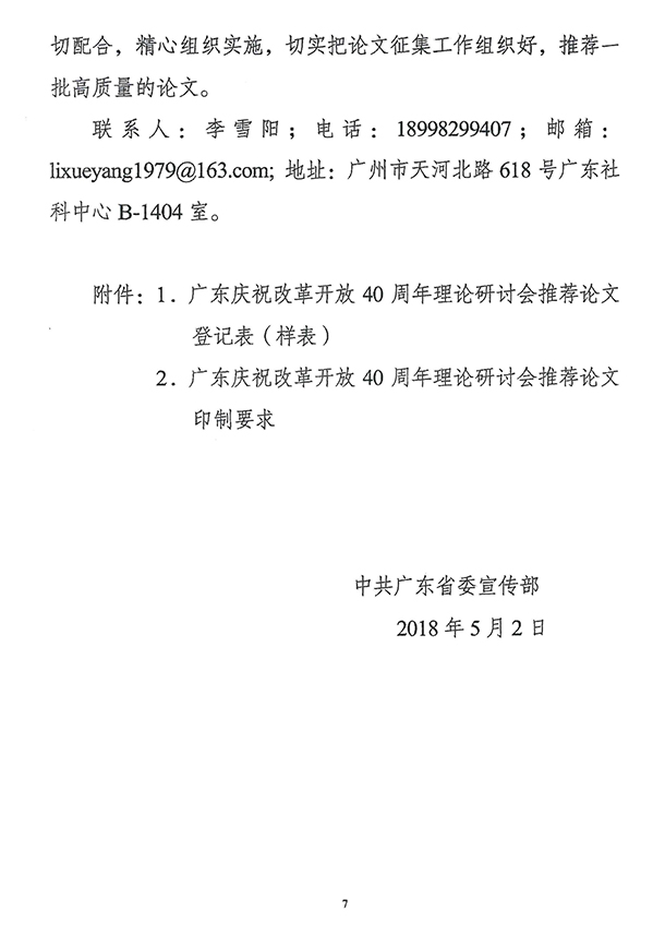 根据中央和省委关于庆祝改革开放40周年活动的部署安排, 省委宣传部将于今年12月举办庆祝改革开放40周年理论研讨会。现将通知(粤宣明电﹝2018﹞43号)转发给你们,请按照通知要求,积极发动广大教师围绕参考选题踊跃撰写理论文章,并于今年11月1日前将文章纸质版(一式7份)报送党委宣传部理论教育科(行政楼517室),电子版发送至邮箱xcb2383150@163.com。宣传部将会同科技处组织专家对论文进行评审,遴选优秀论文推荐给省委宣传部。