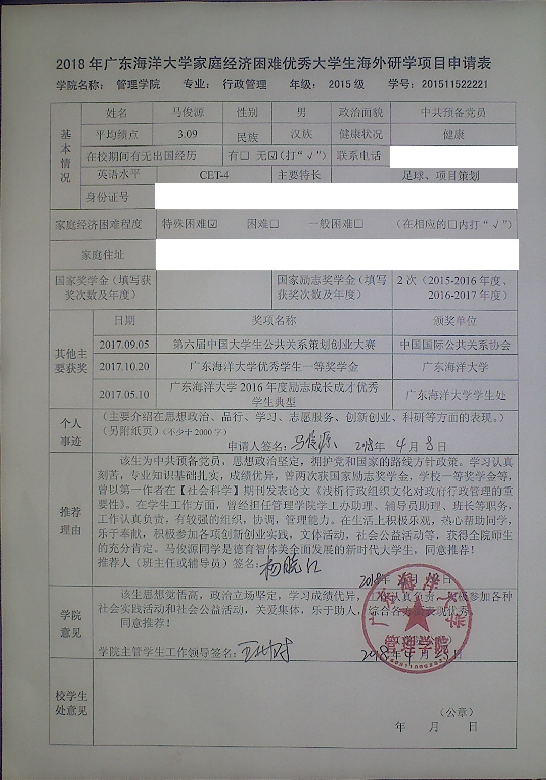 根据《广东省教育厅关于开展2018年“助梦扬帆”资助高校家庭经济困难优秀大学生海外研学工作的通知》(粤教助函[2018]16号)文件精神,经学生本人申请,各学院推荐,学生处处务会议讨论,专家组综合评议并面试,拟报送欧冠管理学院行政管理专业1152 班马俊源同学为参加2018年度“助梦扬帆”海外研学项目候选人,现将有关情况予以公示。如有异议,请在公示期内实名向学生处反映,并提供联系方式,否则不予受理。