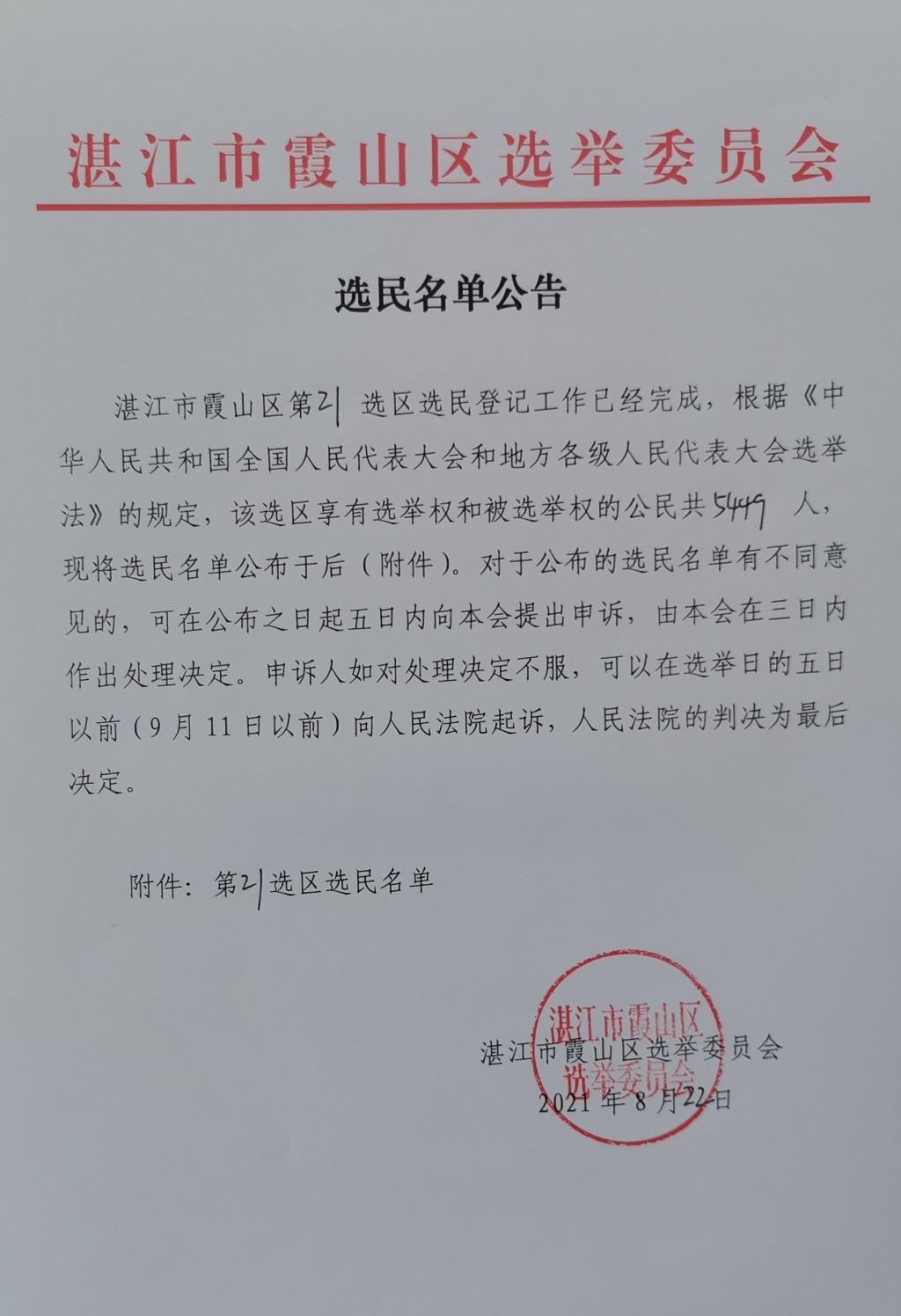 霞山区第21选区选民名单公告