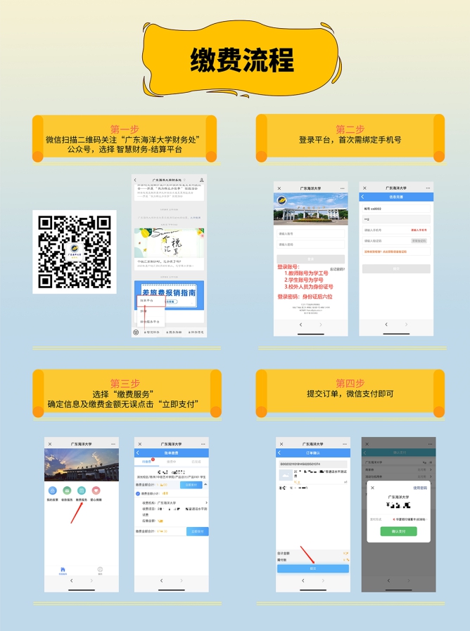 3.缴费确认:报名审核通过的考生请于10月30-31日扫描缴费二维码进入海洋大学收费平台完成缴费(详见附件3《缴费操作指南》),自行下载打印准考证(准考证将作为考试及领取普通话等级证书的凭证,务必妥善保管)。