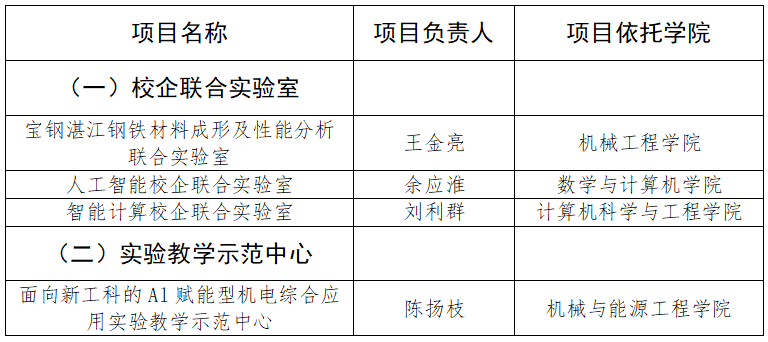根据《关于开展2025年度校级实验教学平台申报工作的通知》(校资产〔2025〕15号),经各教学单位申报、资产设备管理部审核并组织专家评审,按专家评分高低排序,拟将“宝钢湛江钢铁材料成形及性能分析联合实验室”等3个校企联合实验室和“面向新工科的Al赋能型机电综合应用实验教学示范中心”等1个实验教学示范中心(见下表)提交学校教学实验室建设委员会进行立项表决。现予以公示,公示期为2025年6月20日至6月24日。