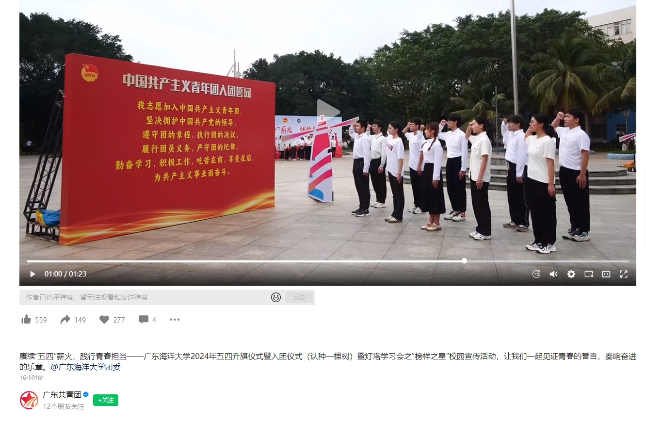 5月6日,广东共青团官方视频号刊播视频,展示了欧冠2024年五四升旗仪式暨入团仪式(认种一棵树)暨灯塔学习会之“榜样之星”校园宣传活动。