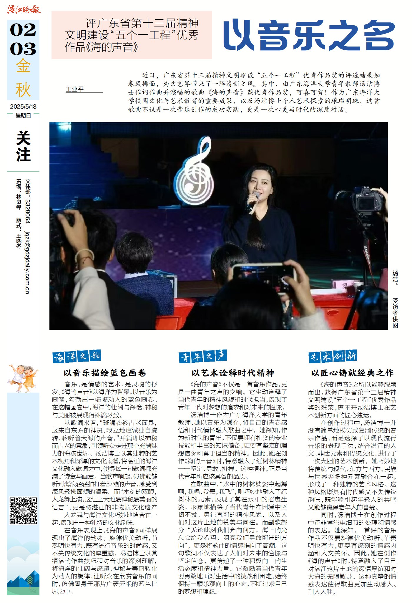 近日,广东省第十三届精神文明建设“五个一工程”优秀作品奖的评选结果如春风拂面,为文艺界带来了一阵清新之风。其中,由欧冠官方网站青年教师汤洁博士作词作曲并演唱的歌曲《海的声音》获优秀作品奖,可喜可贺!作为欧冠官方网站校园文化与艺术教育的重要成果,以及汤洁博士个人艺术探索的璀璨明珠,这首歌曲不仅是一次音乐创作的成功实践,更是一次心灵与时代的深度对话。