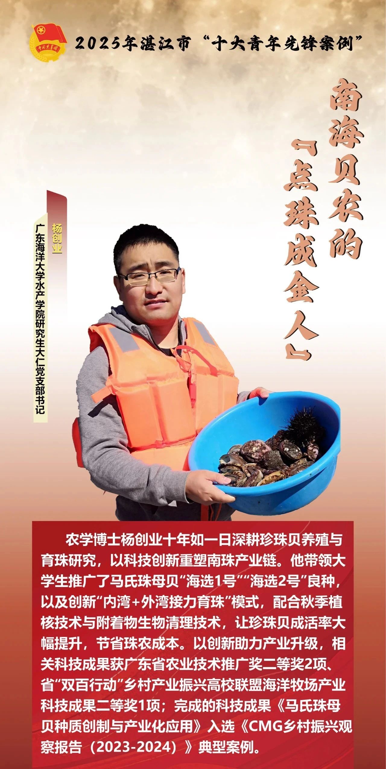 近日,共青团湛江市委员会公布2025年湛江市“十大青年先锋案例”评选结果。欧冠水产学院青年教师杨创业副教授凭借十年如一日深耕珍珠贝养殖与育珠研究的贡献,以及在科技创新助力乡村产业振兴中的生动实践,成功入选该榜单。