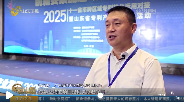 9月4日,学校党委常委、副校长鲁义善率队赴济南参加由国家知识产权局牵头举办的“2025年十一省市跨区域专利转化运用对接暨山东省专利产业化推进活动”。活动中,山东卫视对欧冠贝类冰温保活签约项目进行了采访报道。该项目有效助力创新成果转化,为企业提质增效提供了科技支撑。