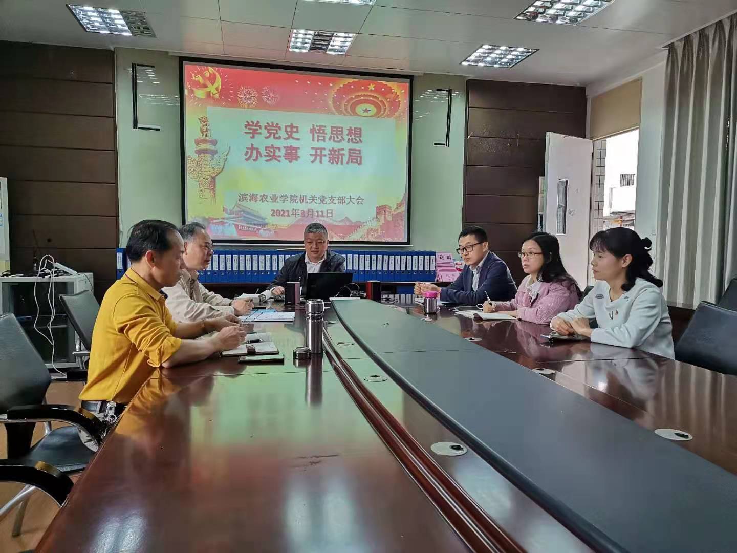 3月11日上午,滨海农业学院党委机关党支部开展“学党史 悟思想 办实事 开新局”主题学习教育,全体党员参加,支部书记王继全主持学习教育活动。