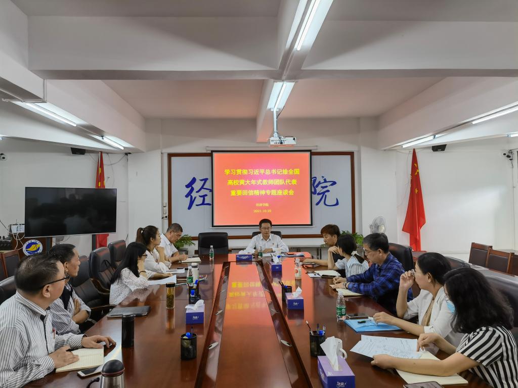 10月20日下午,经济学院在主楼会议室举行学习贯彻习近平总书记给全国高校黄大年式教师团队代表重要回信精神专题座谈会。学院领导,各系(办)负责人、党支部书记,以及海外留学访学归国教师等近20人参加座谈会,会议由学院党委书记肖文辉主持。