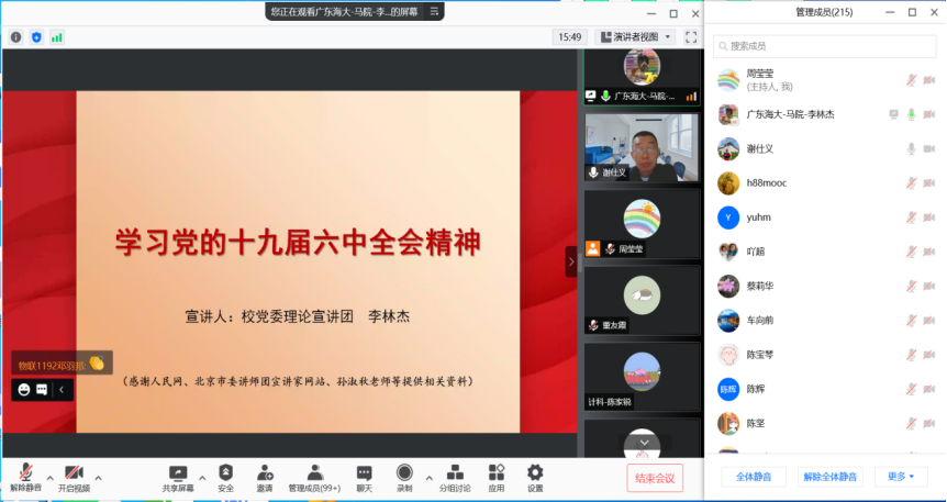 12月21日晚,数学与计算机学院党委通过腾讯会议举行学习贯彻党的十九届六中全会精神宣讲报告会。学校党委理论宣讲团成员李林杰博士以《学习党的十九届六中全会精神》为题作了宣讲报告,学院全体教职工和学生党员共200余人参加了报告会。会议由学院党委书记谢仕义主持。