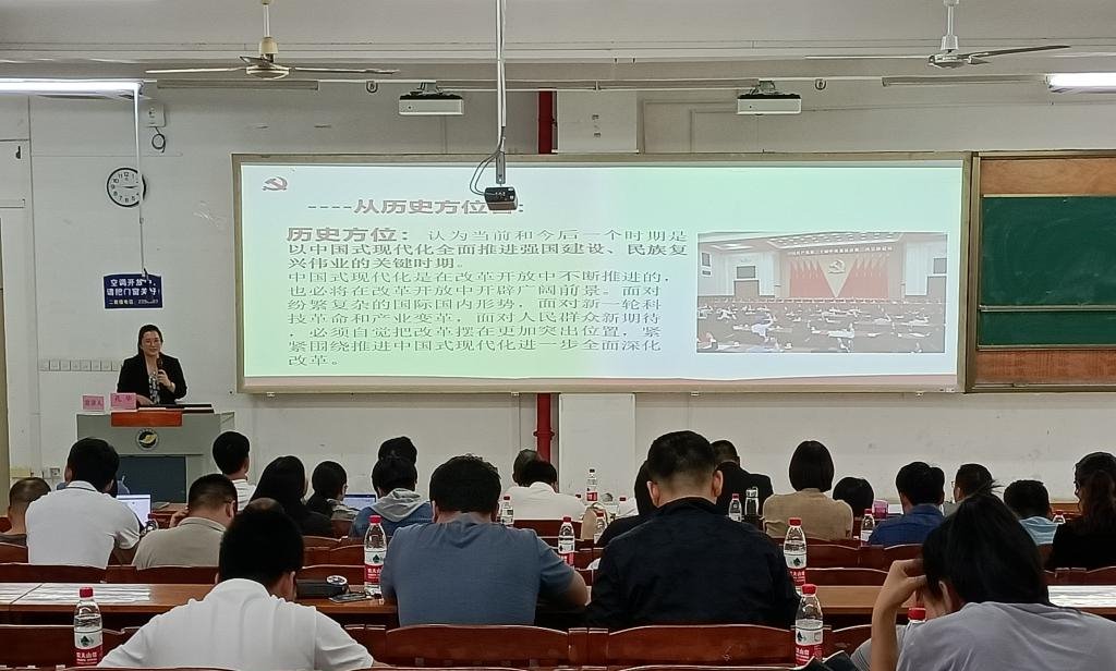孔华以《深入学习贯彻党的二十届三中全会精神 奋力推进学校高质量发展》为题,从党的二十届三中全会的历史背景、重要内容和如何贯彻落实全会精神等方面做了详细宣讲。她结合学校发展的实际,分享了如何以学校“1918”工作安排为主线,科学制订进一步深化改革的工作方案,科学谋划“十五五”改革重点任务清单,以高质量党建引领学院高质量发展。