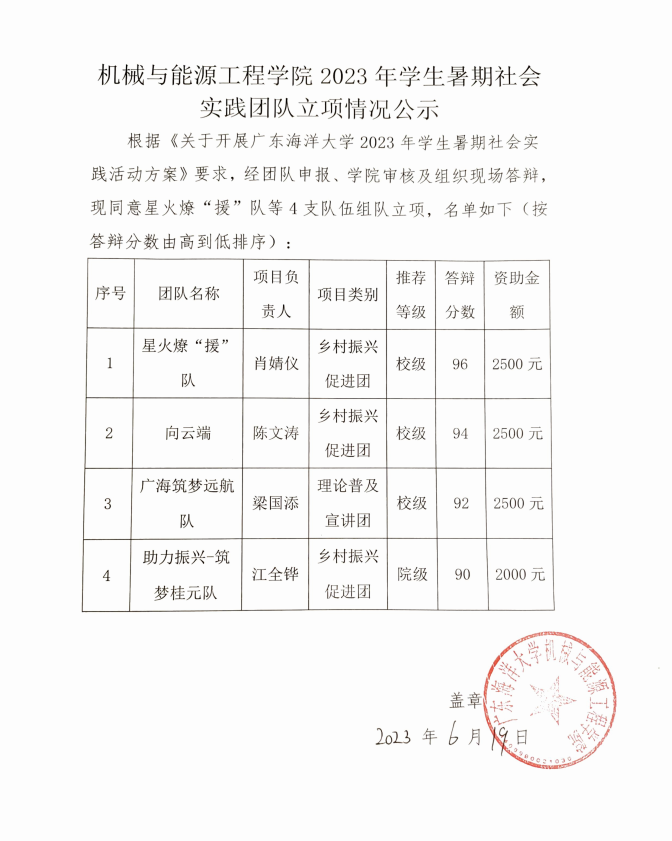 机械与能源工程学院2023年学生暑期社会实践团队立项情况公示