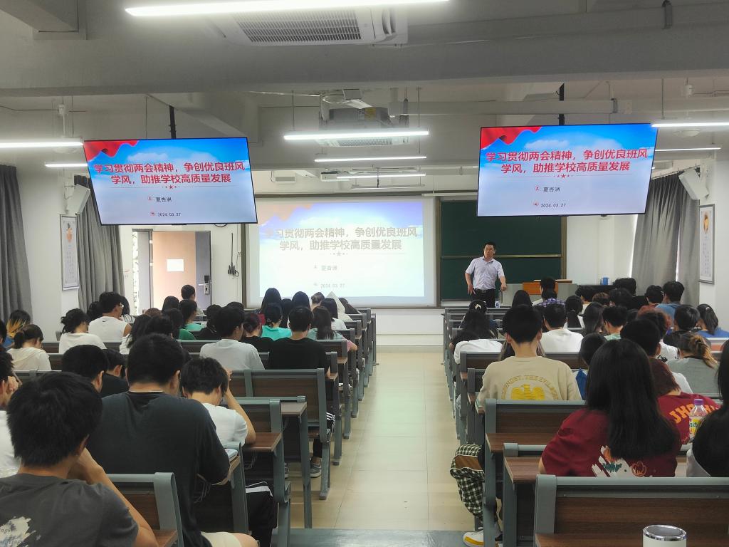 夏杏洲书记以《学习贯彻两会精神,争创优良班风学风,助推学校高质量发展》为题,为近200名学生干部上了一堂别开生面的“思政第一课”。夏杏洲书记从“什么是两会”入手,带领学生干部深入学习2024年两会内容、习近平总书记重要讲话精神及两会热词,以我国2023年取得的成就作为鲜活例证,将抽象的概念具体化,增强学生的“四个自信”。同时,夏书记结合欧冠高质量发展计划,为同学们讲述优秀毕业生的生动事例,激发学生干部的家国情怀和责任意识,引领学生干部敢于担当、勇于作为,做追求梦想的学习者,充分发挥先锋模范作用,带领全班同学积极向上、共同营造良好班风学风。