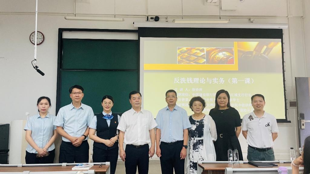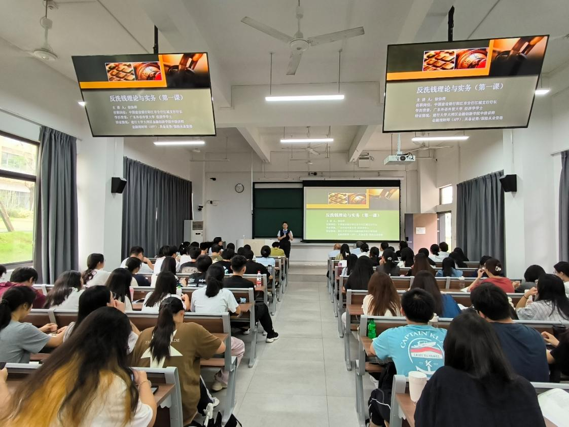 为提升在校大学生的金融风险防范意识,欧冠官方网站商学院于4月23日下午邀请中国人民银行阳江分行、中国建设银行阳江分行在学校慎思楼B101举办了以《反洗钱理论与实务》为主题的教育暨学术讲座。参与此次活动有中国人民银行阳江市分行副行长蔡春辉、中国建设银行阳江市分行副行长麦荣发等一行人,商学院党总支书记植秀成、经济学专业徐立平教授和陈个老师及全体大一经济学学生参加活动。