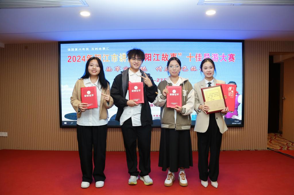 在11月26日,陈嘉慧和黄海敏两位同学在2024年阳江市讲好“阳江故事”十佳红色故事讲解员比赛中表现出色,荣获2024年阳江市讲好“阳江故事”十佳红色故事讲解员优秀讲解员称号。