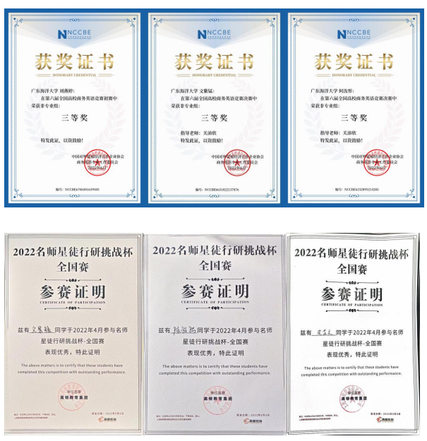 文同学、何同学、刘同学分别在第六届全国商务英语大赛决赛(非专业组)荣获“三等奖”