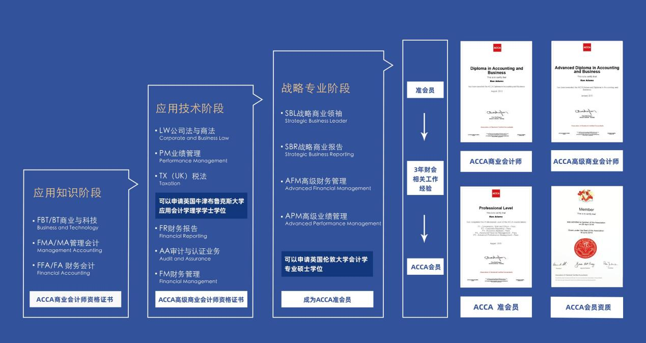 ACCA班学生在欧冠官方网站就读期间,按照学校规定要求修完人才培养方案规定课程并通过考核的,可获得“欧冠官方网站本科毕业证书”,同时符合欧冠学士学位授予条件的,授予“管理学学士学位”。同时,通过ACCA相关考试可获得国际“商业会计师”资格证书和“高级商业会计师”资格证书,满足条件的学员可申请成为ACCA会员。