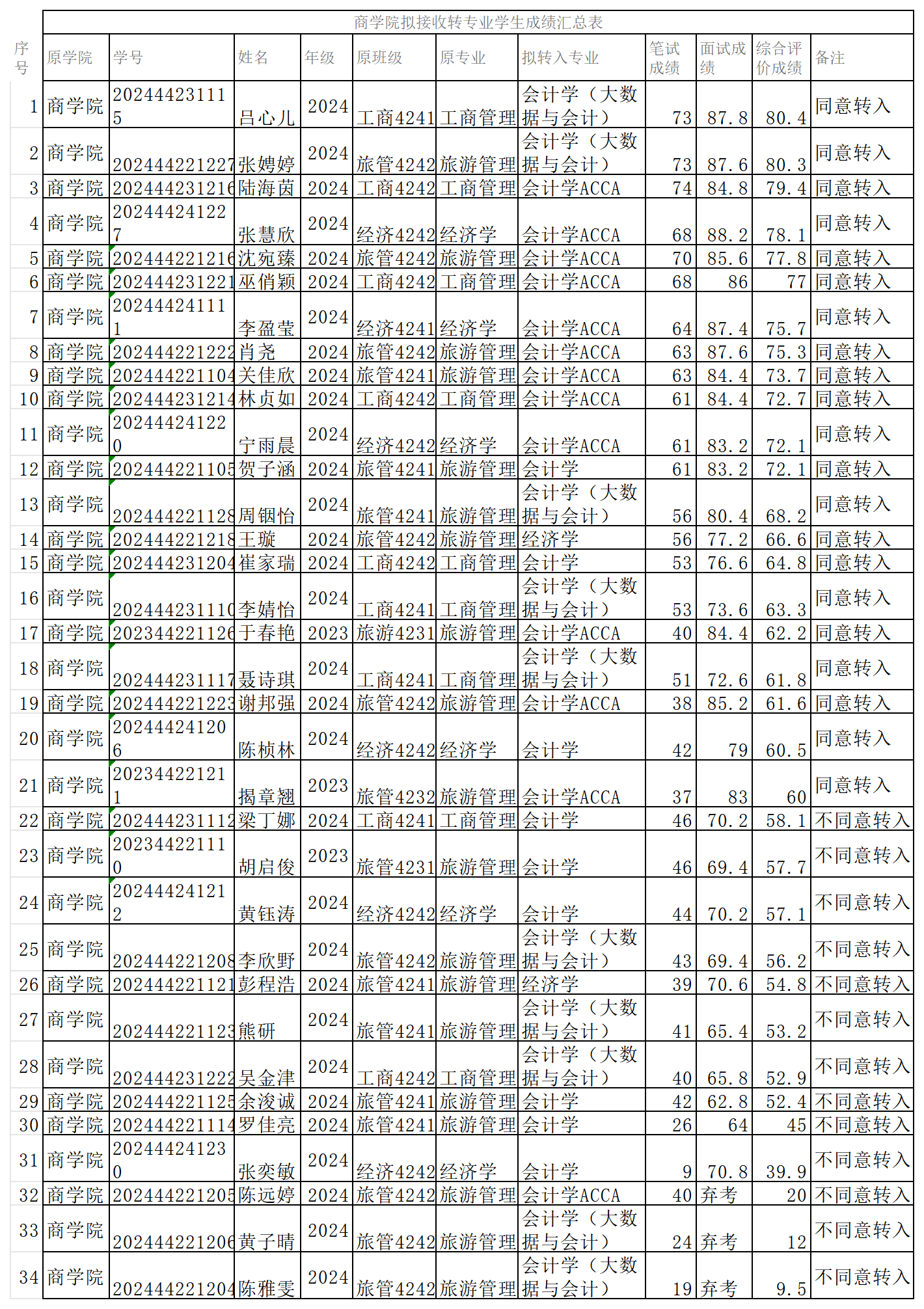根据《欧冠官方网站全日制本科学生转专业管理规定》(校教务〔2019〕60号)、《关于做好2025年度转专业工作的通知》 ,以及《商学院2025年本科学生转专业遴选实施细则》的精神和要求,经商学院转专业工作委员会对申请转入商学院的学生转专业理由、学业成绩、思想道德表现和面试成绩等进行综合评价、排序,现确定拟接受转专业学生名单。