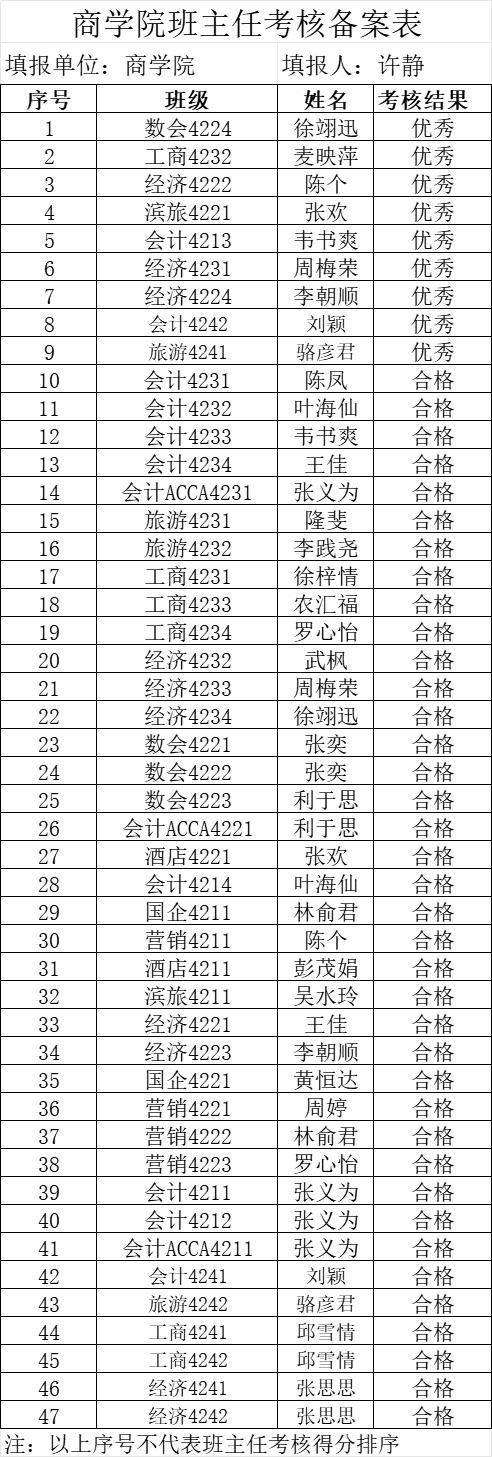 根据《欧冠官方网站本科生班主任工作实施细则》文件要求,本着公平、公正、公开的原则,经学生评价、班主任自评和学院评议三个环节,现将商学院2024—2025学年第一学期班主任考核结果公示。详见《商学院班主任考核备案表》。
