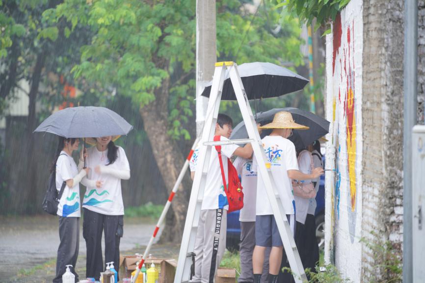 队员们冒雨进行墙绘中 邝伟鹏 摄
