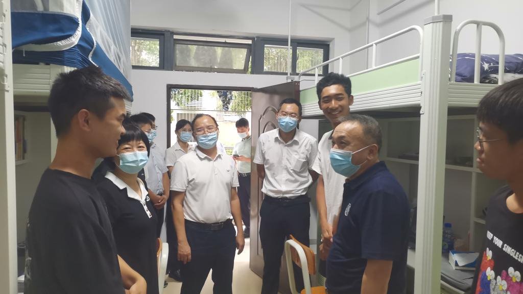 10月9日上午,阳江市政府副秘书长张文彤带领市教育局、市卫生健康局分管负责同志,市公安局、市人力资源社会保障局、市市场监管局、市卫生监督所、市疾控中心分管负责同志或业务科室负责同志到校区,督导检查校园安全和疫情防控工作。校区党委副书记、管委会常务副主任周昌仕,校区党委委员、管委会委员、防控办主任毛琪,以及校区有关部门负责同志参加活动。检查组一行现场听取了校区近期疫情防控工作的情况汇报,分组到校区大...