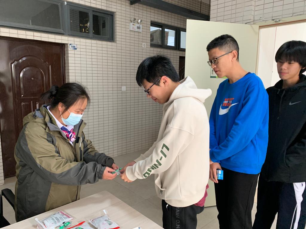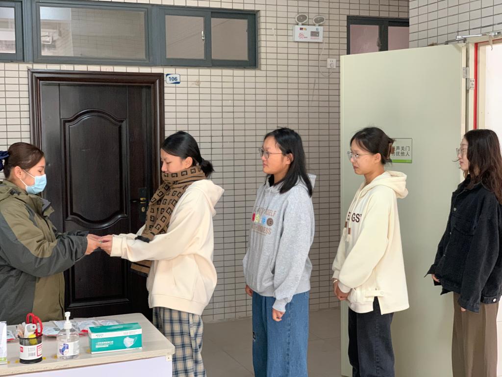 同学们在宿舍楼下排队领取耳塞