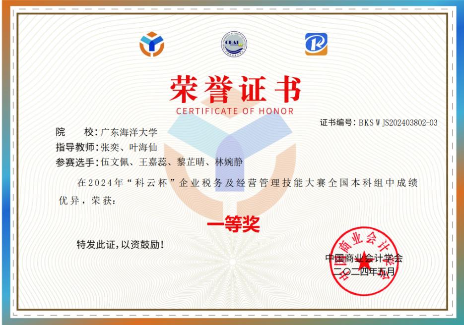 5月25日,由中国商业会计学会主办的2024年“科云杯”企业税务及经营管理技能大赛成功举办,来自全国31个省、自治区、直辖市的800多支队伍参加了比赛,由欧冠商学院会计学专业张奕、叶海仙老师指导的两支团队在此次本科组比赛中荣获奖项,其中,商学院2022级会计专业伍文佩、王嘉蕊、黎芷晴、林婉静四位同学获一等奖,学位列全国第9名,荣获“全国十强”称号;黄志鸿、陈雯莉、徐雅琪、黄钰珊四位同学位列广东省第8名喜获二等奖。