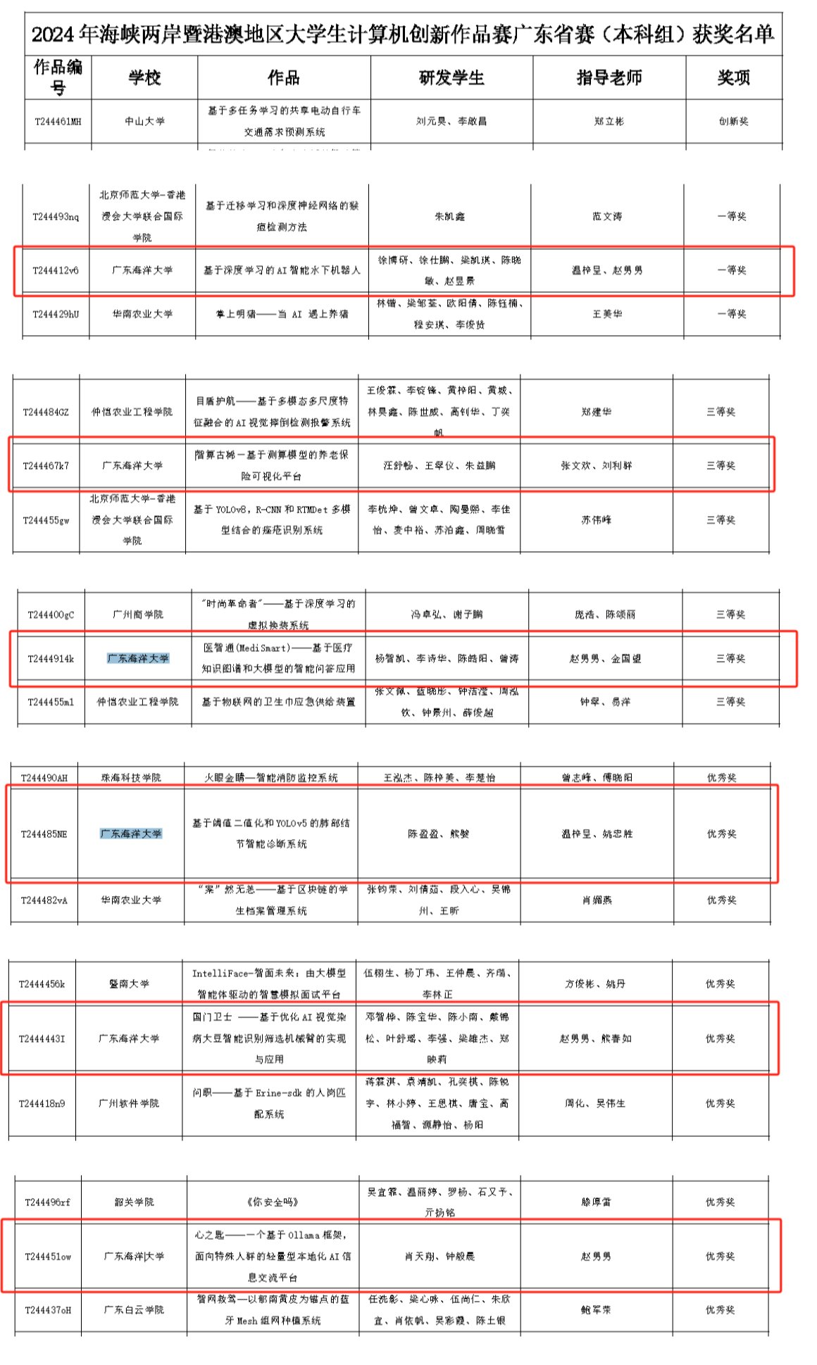 6月14-16日,由广东省计算机学会主办的2024年广东省大学生计算机创新作品赛暨第十九届海峡两岸暨港澳地区大学生计算机创新作品赛在广东职业技术学院高明校区举办。大赛共计吸引了64所高校,300多支队伍参加比赛,参赛人数达5000人。阳江校区计算机科学与工程学院的《基于深度学习的AI智能水下机器人》《智算古稀-基于测算模型的养老保险可视化平台》《医智通(MediSmart)——基于医疗知识图谱和大模型的智能问答应用》等6支参赛支队伍在比赛中分别获得一等奖、三等奖和优秀奖的好成绩。本次比赛取得的佳绩,不仅是对学生技能水平的肯定,也展示了阳江校区的教学成果。