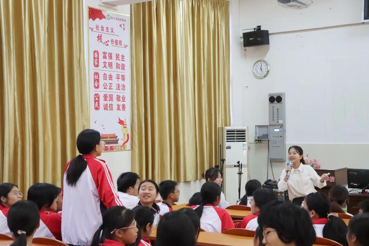 活动中,宣讲员乔圳鑫和冯京艳分别以“阳江农民运动先驱谭作舟”“南路‘江姐’钟竹筠”为题讲述了南路革命的故事。宣讲员吴嘉琪和黄宇珺则分别以“生态绿,海洋蓝,青春红——美丽中国色”和“唱响‘海洋牧歌’,深耕‘蓝色粮仓’”为题向同学们介绍海洋的知识。同学们与宣讲员积极互动,现场气氛活跃。