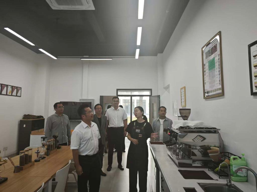 张锦然一行首先参观校园,了解校区建设风貌与育人环境。随后走访商学院,听取李力院长介绍学科优势及百瑞斯塔咖啡实验室在品种改良、烘焙品鉴等方面的成果。双方就利用实验室资源为镇安咖啡提供数据支持、品牌策划与人才实训等达成合作意向。