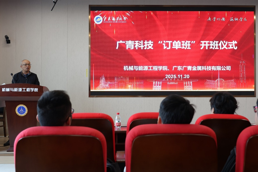 11月20日下午,广东广青金属科技有限公司装备部蔡晓景副部长与人事部专员走进机械与能源工程学院,为学院首届广青科技订单班杨皓钧等12名学子开展开班仪式和专题授课。此次活动是双方在2025年6月签约共建订单班后,“双导师制”订单班人才培养模式落地的关键举措。