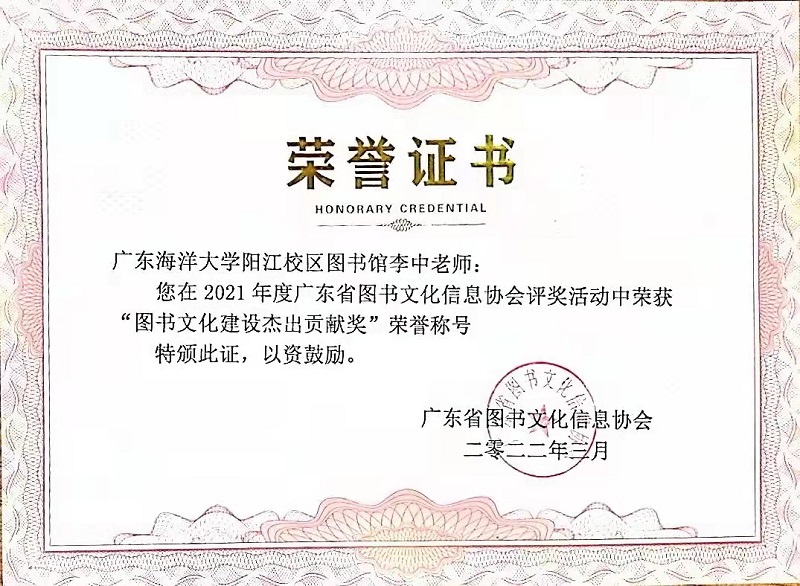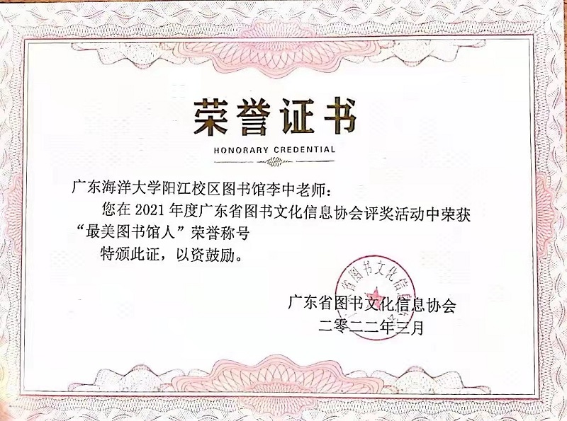 2月28日,由广东省图书文化信息协会举办的2021年度评奖活动拉下帷幕,期间图书馆界相关单位及个人踊跃参与,经过专家统一审核评选后,阳江校区图书馆负责人李中荣获“最美图书馆人”和“图书文化建设杰出贡献奖”两项荣誉称号。
