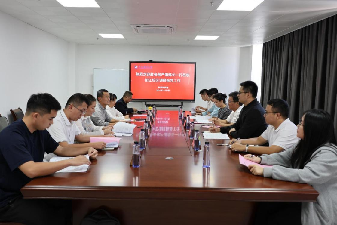 为推动阳江校区教学科研工作的高质量发展,11月6日下午,学校教务部部长严谨、副部长徐文歆、姜晓丹一行赴阳江校区调研,校区党委副书记丁永成主持座谈会,校区党委委员、管理办公室副主任、教学科研部部长白浚宇对校区的教学科研工作进行了汇报。
