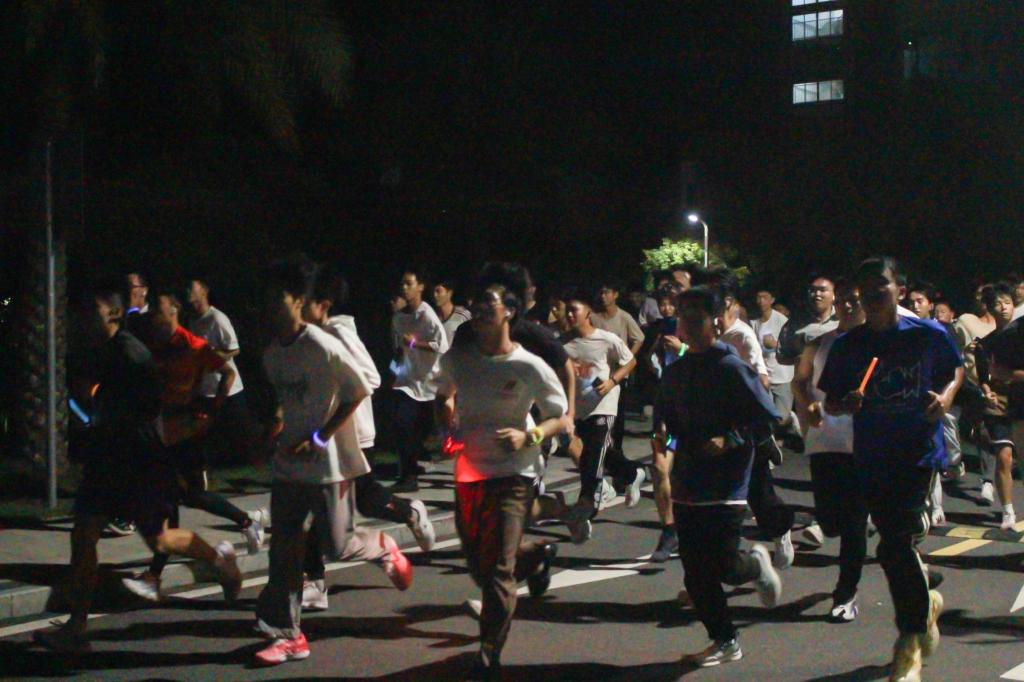 陈永强宣布活动开幕并鸣哨开跑,大家戴着五颜六色的荧光手环,奋勇向前,努力争先,用奔跑的激情与炫彩的荧光挥洒自己的青春轨迹,用动感酷炫和闪闪荧光将田径场点缀成精彩的光影世界,照亮了阳江校区校园夜色。
