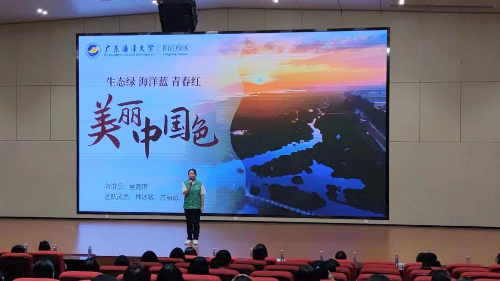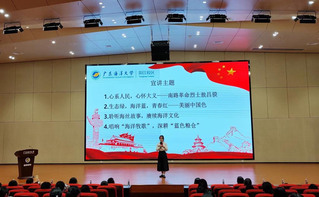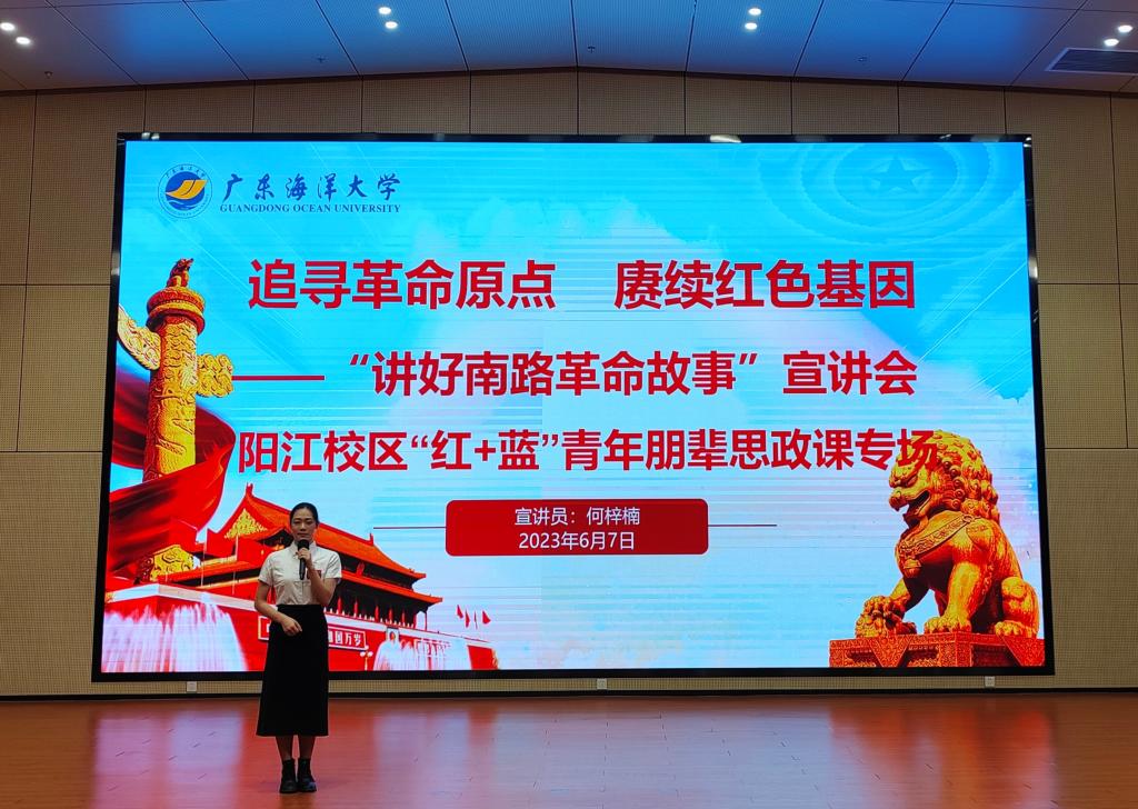 宣讲中,“讲好南路革命故事”宣讲员何梓楠以“心系人民,心怀大义——南路革命烈士敖昌骙”为题讲述了敖昌骙烈士心怀大善,为了改变中国劳苦大众的生活现状而奋斗终生的故事,以此来号召同学们传承红色基因,赓续红色血脉,争做堪当民族复兴重任的时代新人。“思政小助理”宣讲员吴嘉琪从红树林的特点、作用、现状、保护等方面,跟大家分析了保护“海岸卫士”红树林的重要性,号召同学们发挥青春力量一起来守护红树林。李强则结合阳江本土海洋文化资源——“南海I号”和大澳渔港讲述了阳江的海丝故事,并向同学们发起倡议,希望同学们充分挖掘海洋文化资源,提高文化自觉,讲好海洋文化故事。黄宇珺以“唱响‘海洋牧歌’,深耕‘蓝色粮仓’”为题与同学们一起学习了习近平总书记在湛江考察时关于建设“海洋牧场”、“蓝色粮仓”的指示精神,讲述了欧冠在“粤海粮仓”建设中做出的海大贡献,号召同学们要深刻认识海洋强国建设的重大意义,弘扬科学家精神,提高海洋科学文化素质,积极加入海洋生态保护和宣传的志愿服务中,共建青春之未来。